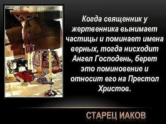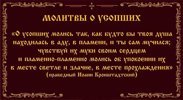 "В ночь на Родительскую субботу рабе Божией Галине приснился умерший дальний родственник. Низко кланяясь, он благодарил ее за то, что она помянула его в записке о упокоении. «Совсем не то, что в обыденной жизни, — делилась она, — там, во сне, я почувствовала жгучую вину перед близкой душой, — и с болью и стыдом поклонилась ему в ответ. – Прости... пожалуйста, прости меня, но я тебя никогда не поминала. Я даже совсем забыла о твоем существовании...» Но он возразил: «Нет. Ведь ты написала в конце записки: «И всех сродников» — и Бог меня помянул!»