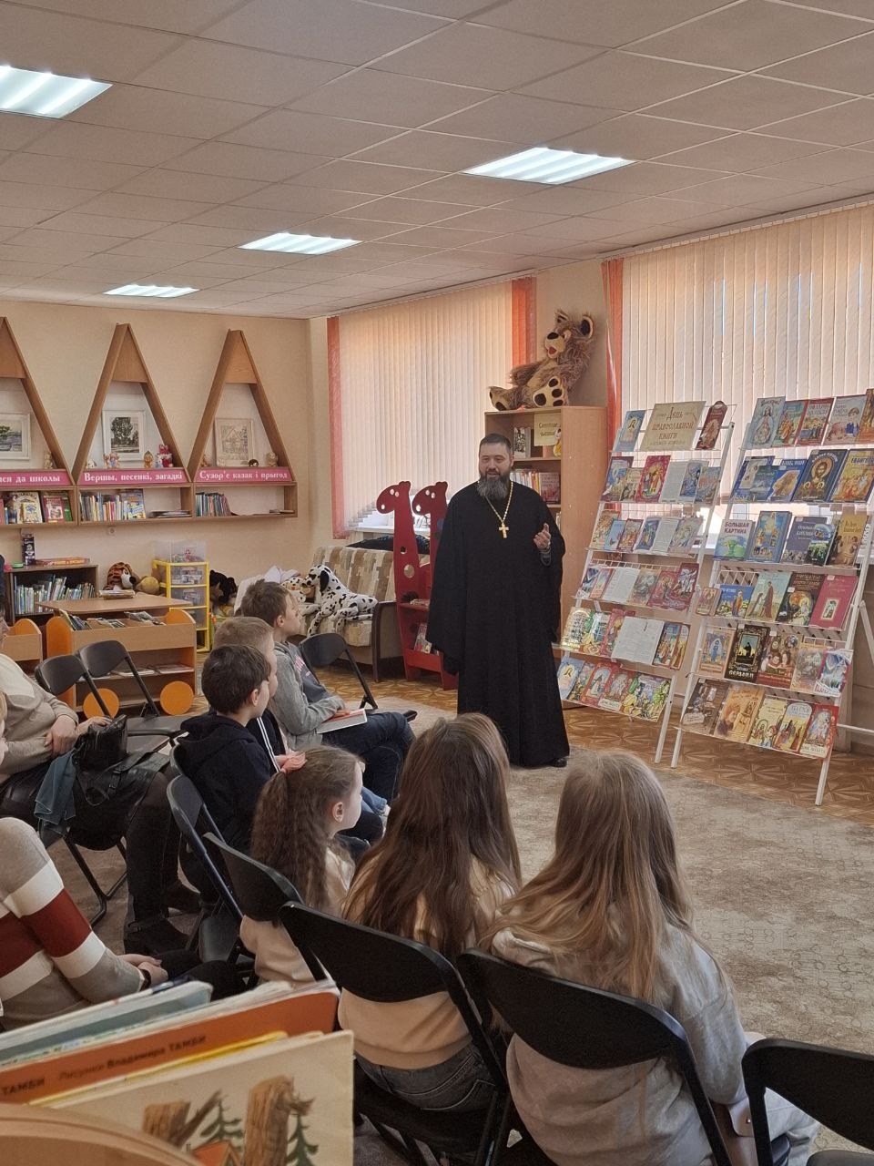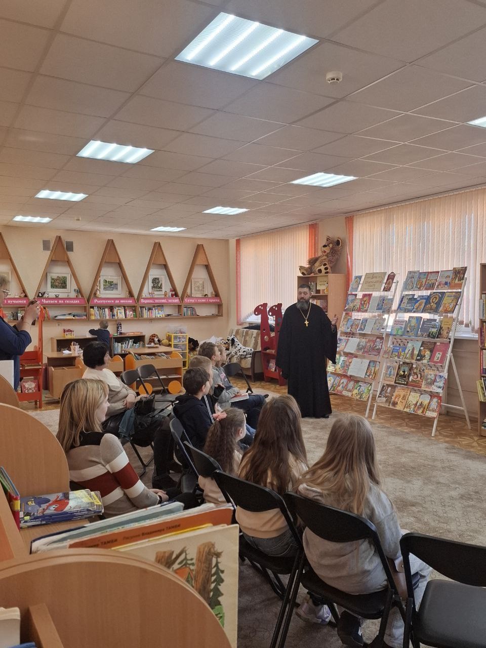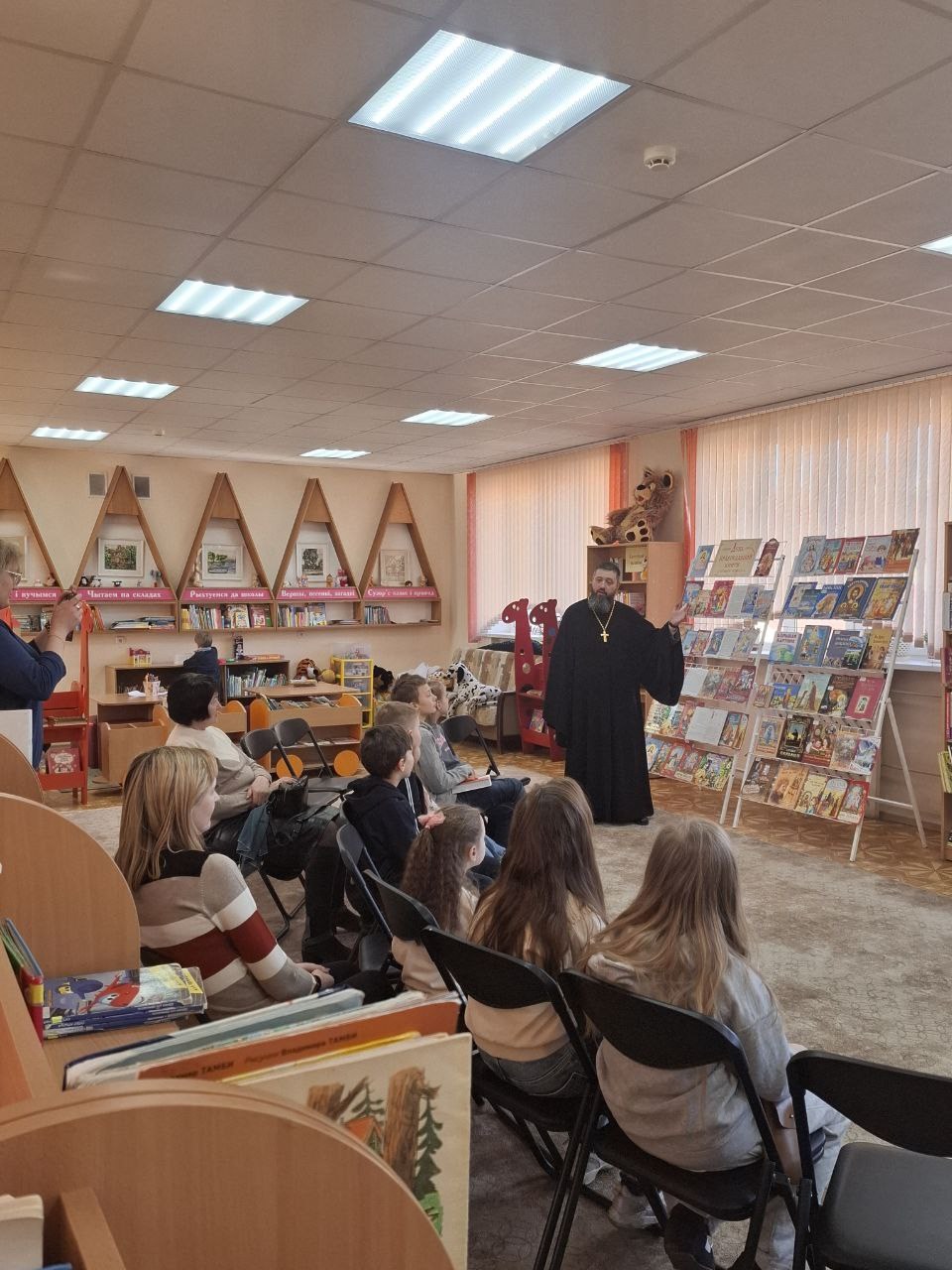 Мероприятие было организовано совместно с библиотекой прихода храма святителя Николая Чудотворца в г. Бресте. По приглашению руководства учреждения в рамках выставки принял участие председатель епархиальной Комиссии по работе приходских библиотек клирик храма святителя Николая Чудотворца в г. Бресте иерей Димитрий Нагнибеда. Священник встретился с юными читателями и провёл с ними беседу на тему православной книги, о создании книг, книгопечатании, а также о предстоящем празднике Пасхи. Приняв живое активное участие в беседе, дети задавали батюшке вопросы и сами делились своими познаниями на тему истории создания книги.